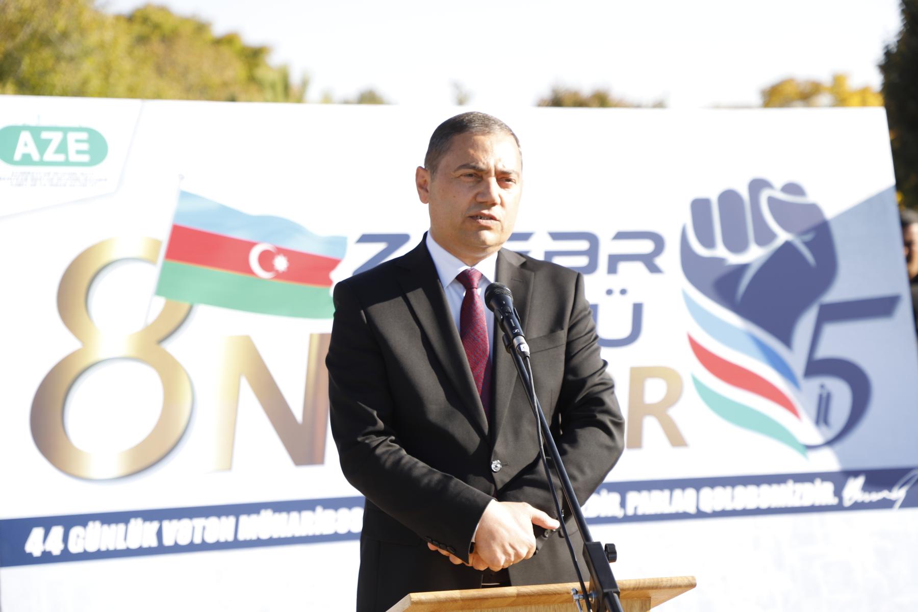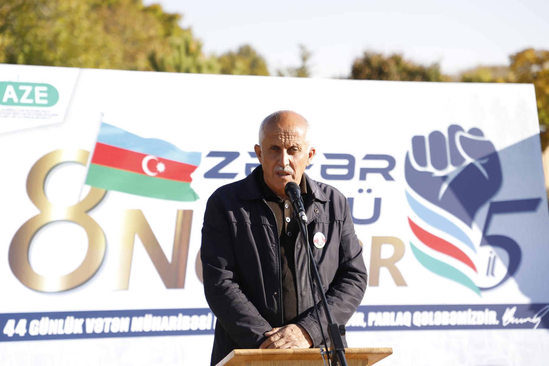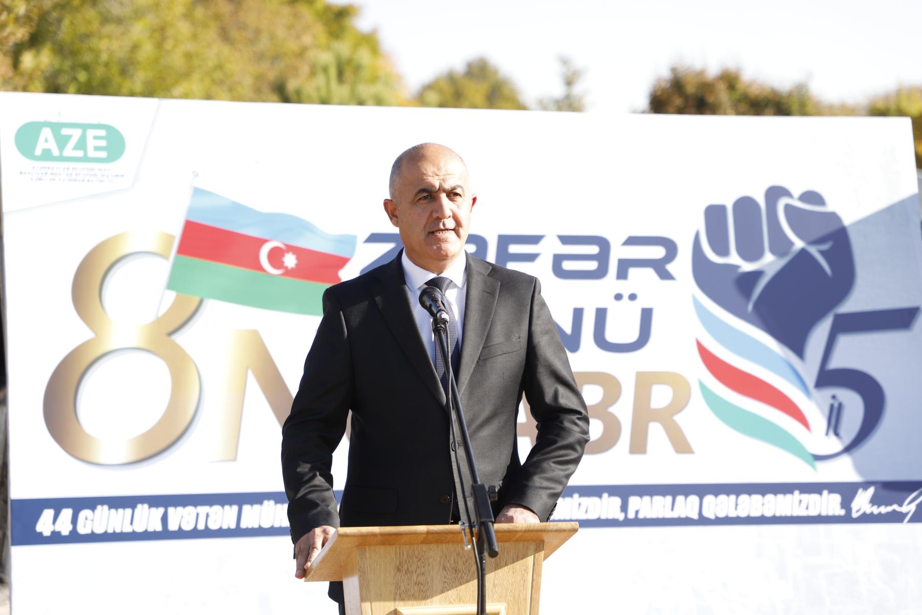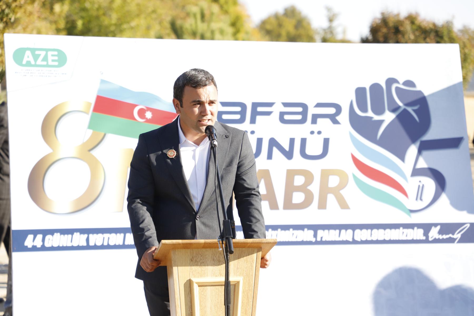 Rayon İcra Hakimiyyətinin başçısı Kamal Ələkbərov çıxışında bildirib ki, Ali Baş Komandan, Prezident İlham Əliyevin rəhbərliyi ilə Azərbaycan Ordusunun qəhrəmanlığı və xalqın birliyi nəticəsində əldə olunan Zəfər Azərbaycanın qüdrətini və milli həmrəyliyini bir daha dünyaya göstərdi. O qeyd edib ki, Vətən müharibəsində gənclərimizin göstərdiyi igidlik və fədakarlıq bu tarixi Qələbənin əsas dayağı olub.
